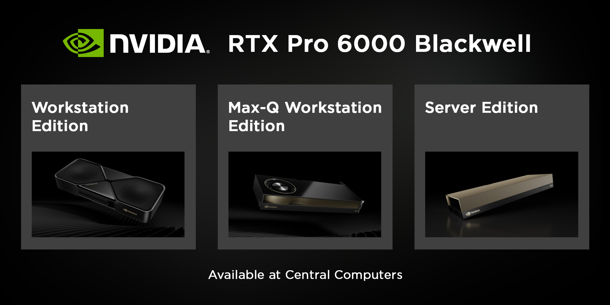 At Central Computers, we carry the entire line of NVIDIA Blackwell workstation graphics cards and offer a variety of customizable system configurations built around them.