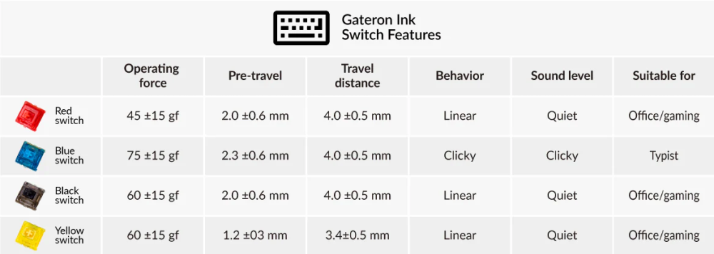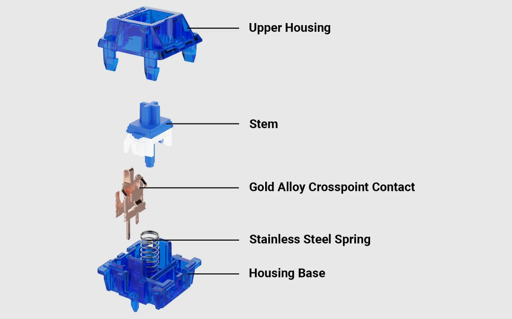 Upgraded housing helps to make the contact leaves more secure, which prevents fallout. The whole standard construction of Gateron Ink switches let you enjoy typing on them.