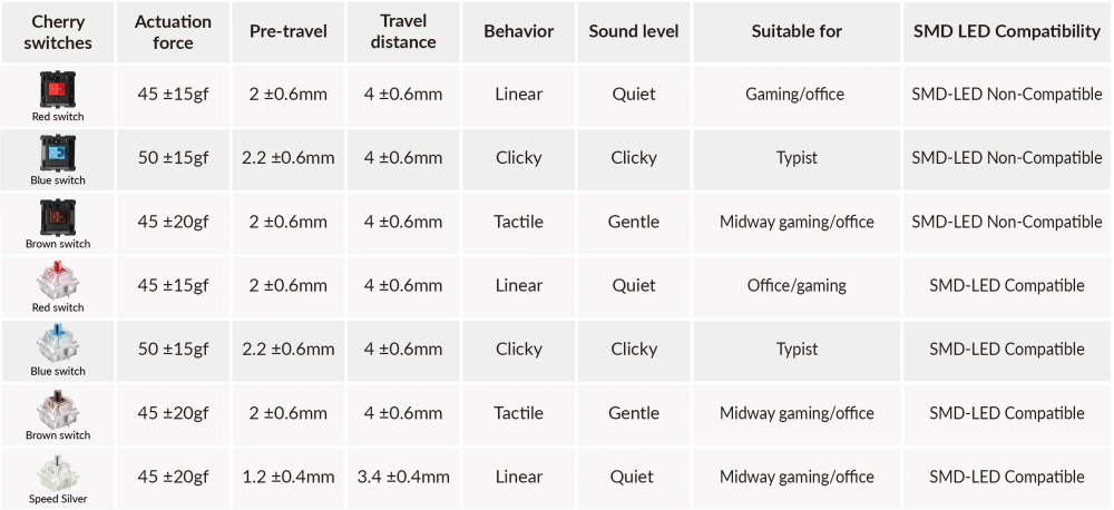 Cherry offers the popular and widely used switch technology for mechanical keyboard market. Cherry MX Switches and Cherry MX RGB Switches are available in several variants and the main three are Cherry MX Red, Blue and Brown. They successively deliver linear, click, and tactile style feedback.