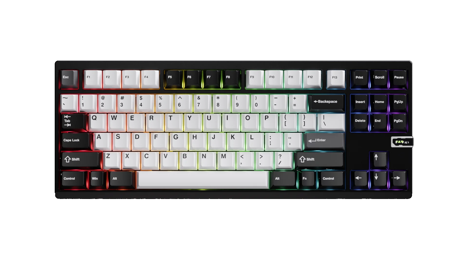 | Features | 1.Full aluminum CNC shell, Jet Black color, combining aesthetics and practicality. 2.87-key keyboard features a compact design that perfectly fits various desktop setups, saving space while enhancing work efficiency. 3.With Self-illuminating Module: The self-illuminating module features tritium tubes that glow in the dark. It can remain bright for a really long time without ever needing a power source. 4. Special Ripple Weight Design: The weight design features textured details, enhancing stability and aesthetics. 5.The keycaps are designed with three distinct colors, creating a bold and fashionable look that stands out. Also, Our custom driver allows you to control the RGB effects on each key, personalizing your typing experience. 6. Mounting Style:gasket/ Elastic Silicone Mount |